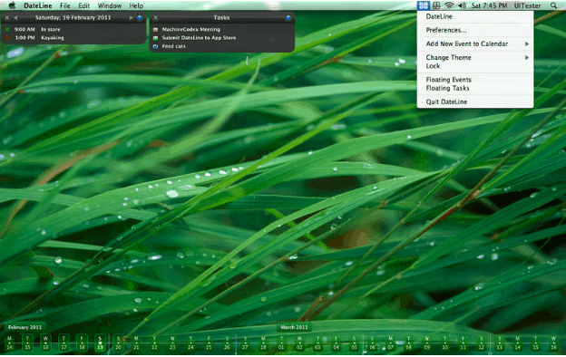 DateLine copies your calendar events and tasks from iCal to your desktop, and offers additional customization features such as color, font, size, themes, and transparency. You can view up to 69 days at once in a calendar dateline. The DateLine app costs $4.99.