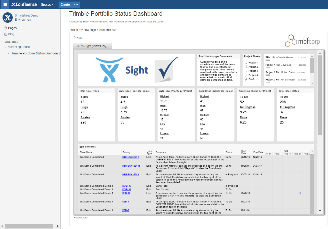With Smartsheet and Confluence, you can embed anything in Confluence that you can publish in Smartsheet, including sheets, web forms, reports, and dashboards. As changes are made, published Smartsheet items in Confluence are updated in real time, so you can be sure that everyone has access to the most current information. Additionally, you can access Smartsheet and JIRA directly from Confluence if further drill down is desired.