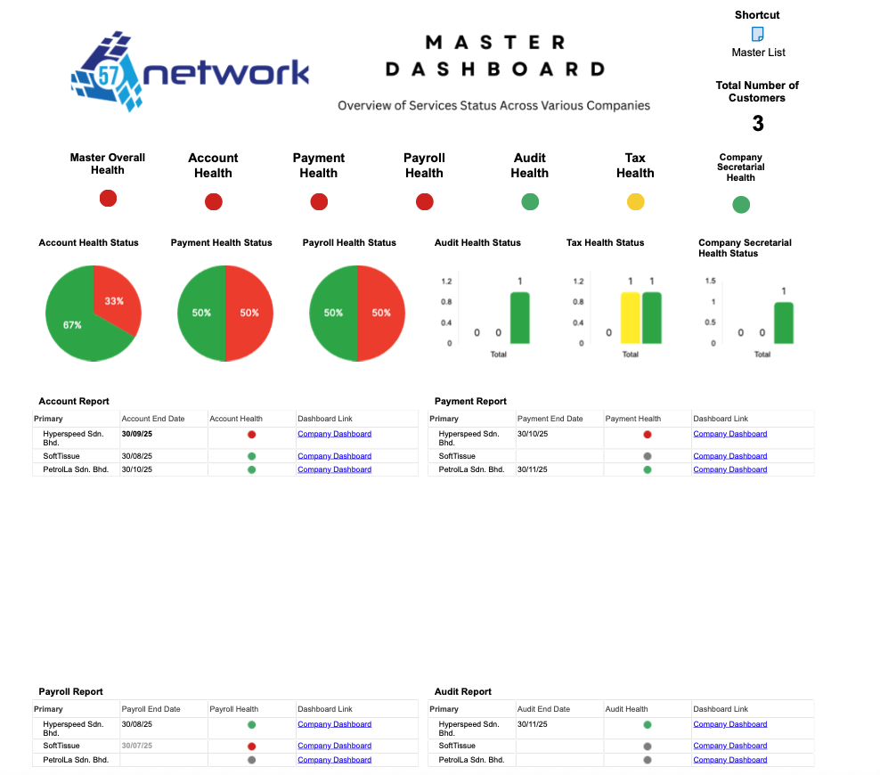 A Smartsheet-powered dashboard for accounting firms to track client service health across accounting, payroll, tax, audit, and secretarial services. Improve visibility, accountability, and customer service with automated reminders and real-time updates.