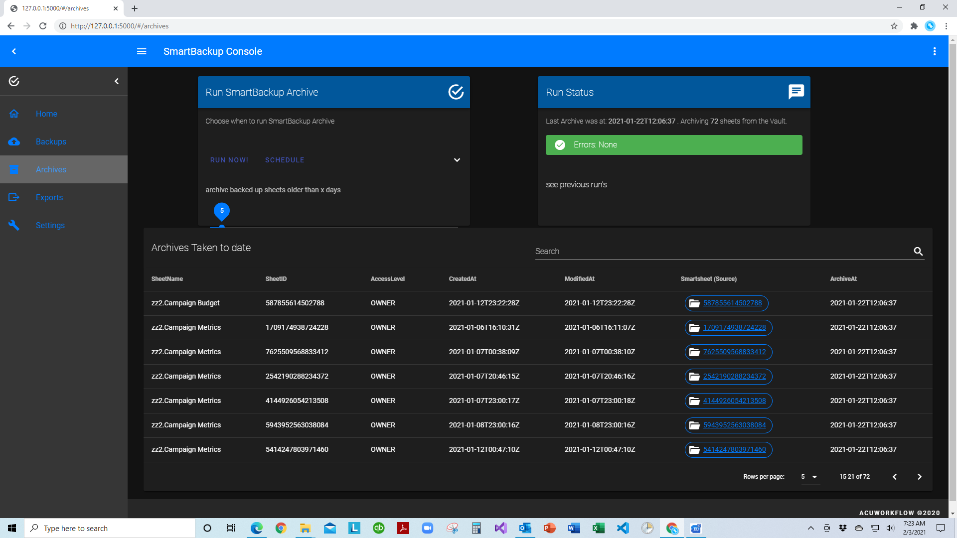 SmartBackup addresses the backup and restore needs of all Smartsheet licensed users. It includes a backup function, an archive function, and an export function, and provides full-fidelity backups of your Smartsheet sheets. This means that you can easily restore rows, data, and sheets including Conditional Formatting, Formulas, Cell Links, Forms, and Attachments. It provides additional features not available in any other offering, such as a catalog to keep track of what has been backed-up, archived, and exported, and support for DRP Recovery and Compliance/Governance requirements.