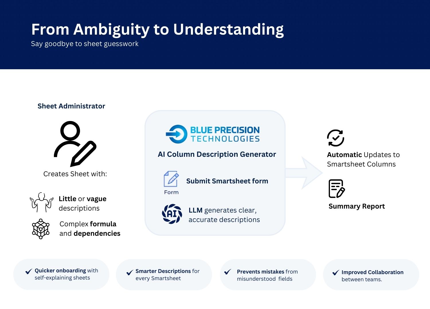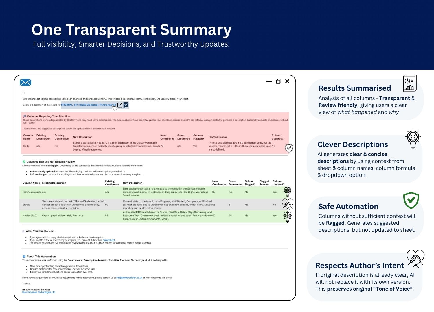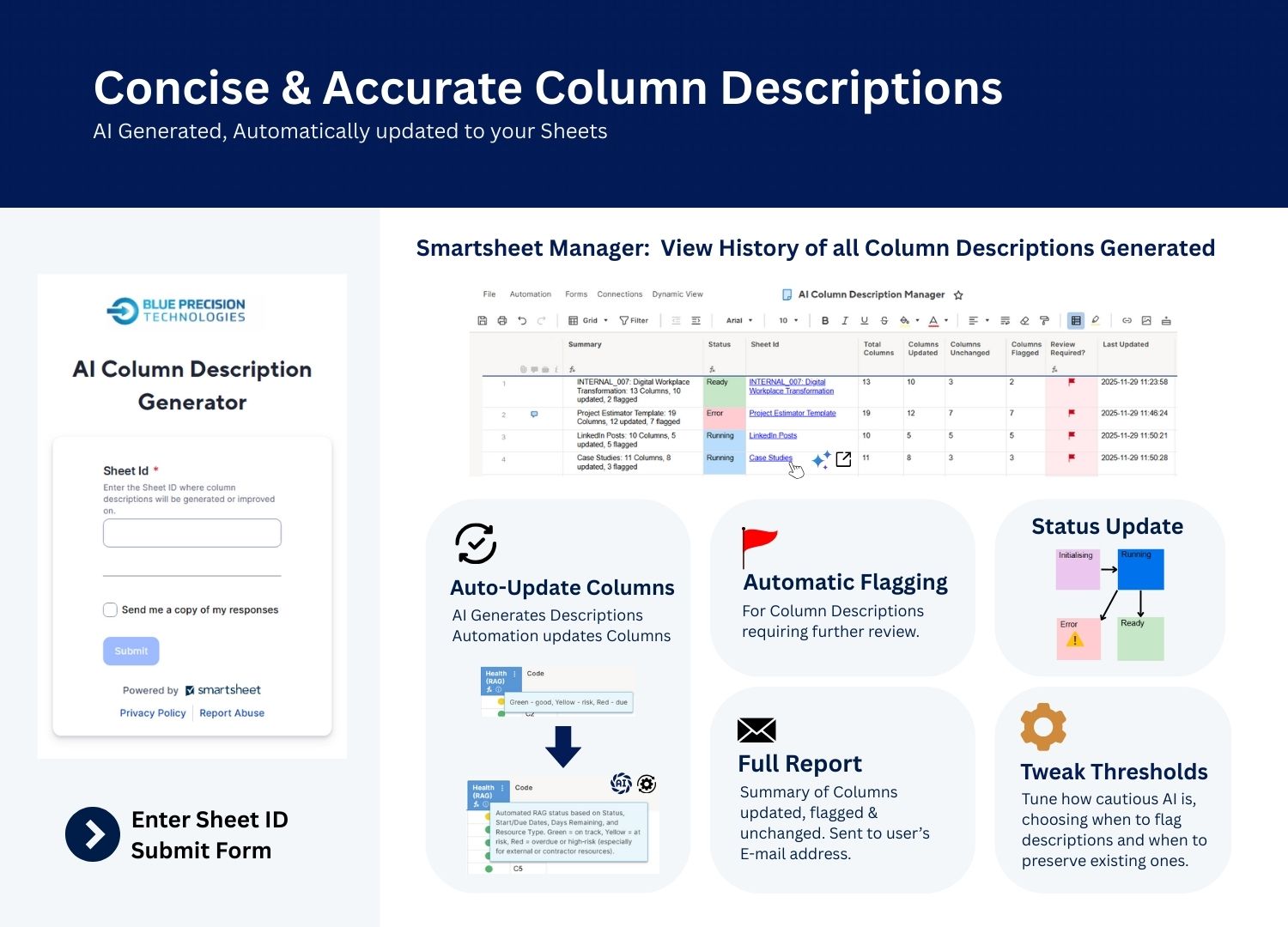 Automatically generate clear, accurate Smartsheet column descriptions using AI. Improve documentation, reduce confusion, and streamline onboarding with transparent summaries, confidence scoring, and safe automated updates.