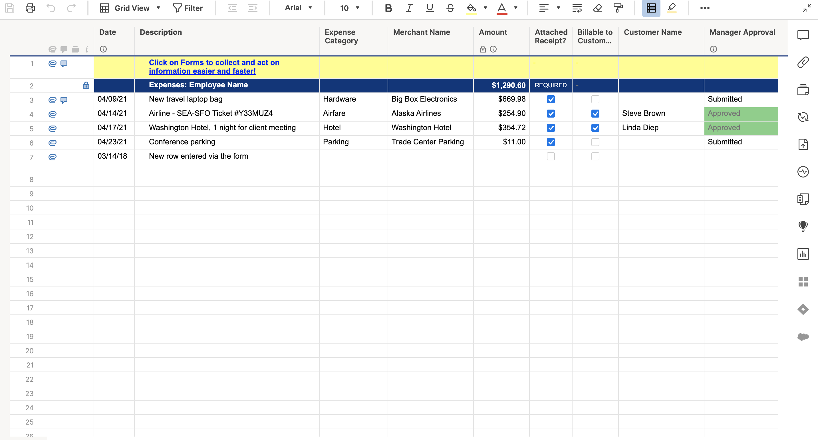 Keep track of business expenses on your laptop or mobile device, and simplify supervisor approval and reimbursement by sharing this sheet with attached receipts.