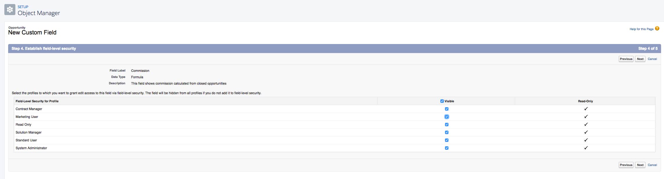 Choose which types of users can view the commission field. By default, custom-created fields are visible but uneditable to all (Read Only). Choose permissions based on your organization’s culture, but never assign individual reps edit permissions. In this example, all are being left at default. Click Next.
