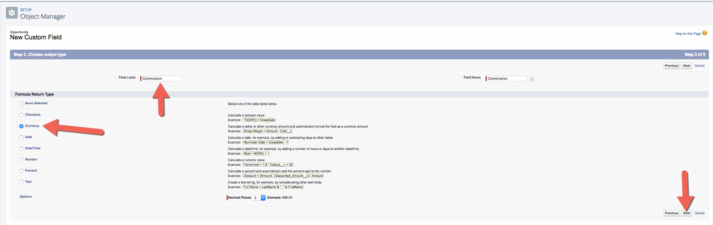 Choose Currency under Formula Return Type, and give it the field label Commission. Leave the decimal places at 2, since this will be a dollar and cent amount. Click Next.