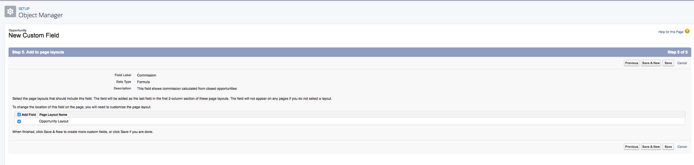 Decide which layouts you want this field to appear on. In some cases, there might be more than one, but in this case, there’s just the Opportunity Page Layout. Make sure it is checked, otherwise the commission field won’t appear. Click Save.