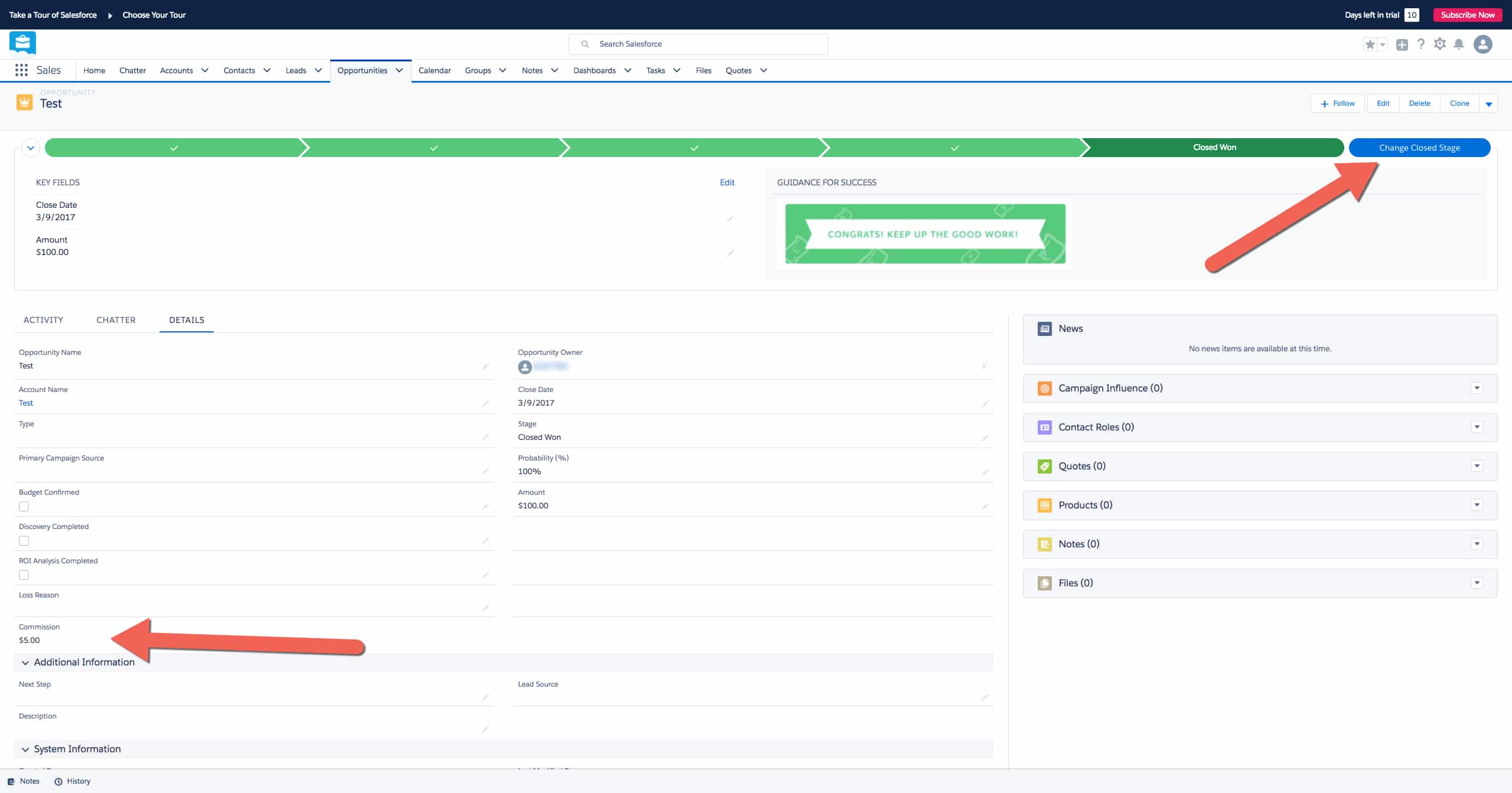 Now go to Opportunity, and change the stage to Closed Won. In the Details tab, you’ll see that your commission has changed to $5.00, which is five percent of the Opportunity Amount $100. Congratulations, you’ve successfully created a commission tracking field that will update in real time.