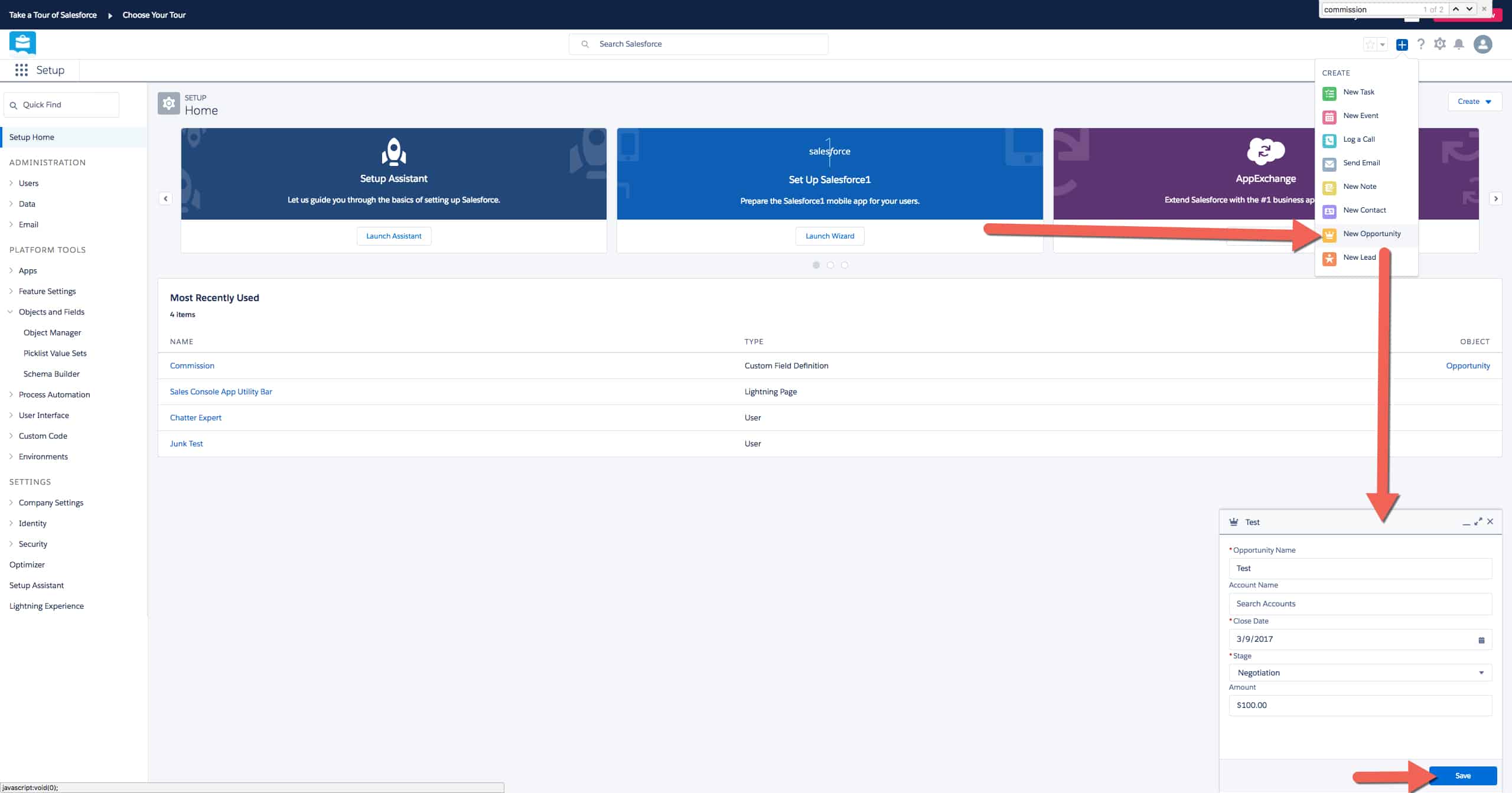 The final step for any change in Salesforce is testing. On the top toolbar, click +, select New Opportunity, then fill in a “Test” opportunity set to close today, for the Account “Test,” worth an amount of $100. Click Save.