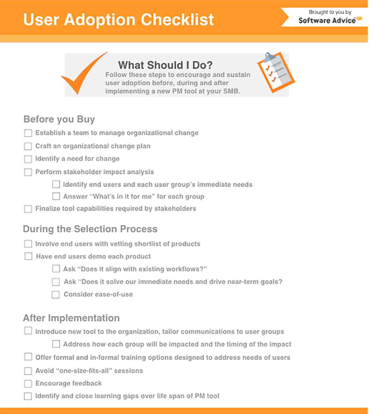 Software Advice also offers the following checklists for choosing paid software. The considerations can apply to programs with any type of license.